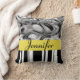 This pillow will add a unique touch to your home decor! Personalise with a first name, last name, nickname or any word you choose! Design features black and white stripes, a metallic liquid pattern and a yellow stripe around the middle that displays your custom text! This decorative pillow will look great in a girls or baby bedroom, on a couch, or outdoor furniture!