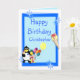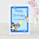 Fully customisable card with funny clown, penguin and ice cream and balloons, on a blue background. Easily personalise this design by adding or changing the text.