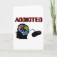Side profile of a man’s face, sectioned to revile a brain in primary colors with added pink flesh area. All with a video game remote control plugged into the back of the brain. Word, “Addicted” written in large red & black font.