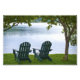 A travel photograph of two empty Adirondack chairs under trees facing a calm lake in the Adirondacks. This photo will make a unique souvenir gift from your New York, USA vacation.