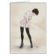 This illustration shows a woman with a pink corset leaning over to adjust the garters on her black stockings as she gets dressed.