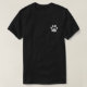 There is a paw on the front. The blue, green and teal design on the back says "Adopt. If It you can't adopt, Foster. If you can't foster, Sponsor. If you can't sponsor, volunteer. If you can't volunteer, Donate. If you can't don
