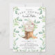 Cute baby shower invitation featuring sweet baby bunny rabbit with mum sitting on a tree stump and framed with natural green watercolor leaves set on a white background. Flip our invite over to view a matching green leaf back for an extra special touch..