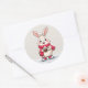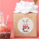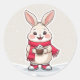 a whimsical cartoon sticker featuring a vector-style illustration of a chubby, adorable baby bunny with a bright, cherry-red scarf wrapped around its neck, standing on its hind legs, and wearing a pair of tiny, snow-covered boots, holding a miniature marshmallow-topped hot chocolate cup in its paws, with a joyful, toothy grin on its face, set against a flat, soft, and creamy white background that resembles freshly fallen snow, with the overall aesthetic evoking a sense of winter wonderland charm and cuteness.