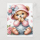 Adorable baby teddy bear with pink hat and bow, holding hands near mouth, watercolor clipart, for kids designs