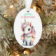 This is a cute Christmas ornament for parents or grandparents to give to a child. The front of the ornament has an image of an adorable baby unicorn wrapped in a string of colourful pastel Holiday lights. The mint green and pink text says "MERRY CHRISTMAS". The back of the ornament has your custom text which is separated by another unicorn image. Easily change the text to anything you'd like!