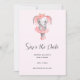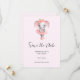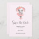 Save the date card with an adorable illustration. A grey girly elephant with a pink tutu and flowers dancing ballet, en pointe.