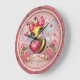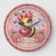 This enchanting circular wall clock features a whimsical 3D digital illustration of an adorable bumblebee with large, expressive blue eyes. The bee wears a pink, heart-patterned bow and holds a shimmering pink heart adorned with smaller red hearts. A cream-colored ribbon banner across the bottom displays the embossed text "Bee Mine" in a delicate red script. The scene is decorated with soft pink roses, green leaves, and a background of shimmering pink light and tiny floating hearts. A thick, solid pink decorative border frames the entire design. The clock face border consists of a light cream ring with black, outlined numbers (1 to 12) and simple black hands centered over the bee.