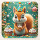 Charming squirrel wearing a festive party hat, surrounded by vibrant decorations and colourful cupcakes in a playful, cheerful setting.