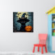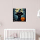 Charming black kitten dressed as a witch with a pumpkin and festive Halloween ambience, surrounded by mystical forest bat silhouettes. Perfect for Halloween-themed designs and seasonal fall inspirations.