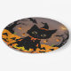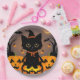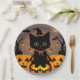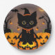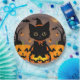 Charming illustration featuring a cute black kitten in a witch hat, sitting amidst glowing jack-o'-lanterns. Perfect for celebrating the fun and spooky spirit of Halloween. A delightful scene for festive decorations.