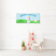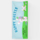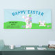 Gather together for an Easter egg hunt and display this cute banner featuring a pretty blue background. A cute white bunny gathers eggs that look like they may fall and another bunny pops his head out to see what all the fuss is about. Personalise this banner with your event info.