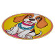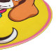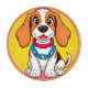 Illustration of a happy cartoon dog with expressive eyes, wearing a decorative collar, and sitting against a colourful circle background. Ideal for pet-themed designs, children’s art, or playful graphics.