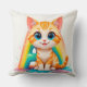Cute orange tabby kitten illustrated in a cartoon style sitting on a rainbow with colourful splashes.