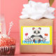 Adorable cartoon panda bear and three cubs holding balloons. Yellow border and blue text that reads Happy Birthday!