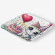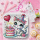 A cute grey cat wearing a party hat, sitting next to a decorative pink cake, accompanied by a lovely heart-shaped red balloon on a colourful background, radiating joy and festivity.