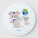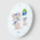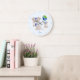 Add a cute touch to your home bedroom or nursery with this adorable puppy wall clock. Clock features a mummy dog with a baby puppy. Both dogs are wearing blue bows and the mum dog is wearing a collar. There's also a dog house in the background. Customise the clock with your little girl or boy's first name.