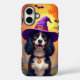 Adorable dog, likely a Cavalier King Charles Spaniel, wearing a vibrant purple witch's hat. The dog has a cheerful expression, showcasing its playful nature. Surrounding the dog are colourful autumn leaves and carved pumpkins, enhancing the Halloween theme