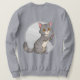 A cute grey tabby kitten stands upright, holding a tiny flower with its paws. Cheerful, playful, and inviting, perfect for family, pet care, or kids’ branding.