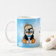 A cute funny hand drawn cartoon penguin with snowballs and snowflakes background. Personalised coffee mug.