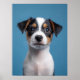 A captivating close-up portrait of a Jack Russell Terrier puppy with a black, white, and brown coat, looking straight into the camera with big, soulful blue eyes. The puppy’s ears are perked up slightly, and its curious expression is set against a soft blue background, highlighting its cute and innocent features.