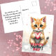 This customisable Valentine's Day postcard features an adorable illustration of a cute, fluffy kitten holding a heart. The kitten has a soft, warm colour palette with shades of orange, white, and brown, and is surrounded by small, floating pink hearts. The text "HAPPY Valentine's DAY" is prominently displayed at the bottom of the postcard in a playful, bold font with "HAPPY" ans d "DAY" in red and "Valentine's" in black cursive. The text on the front and on the back is fully customisable, allowing you to add your own personal message or greeting to make it unique and special for your loved ones. This charming and heartwarming design is perfect for expressing your affection on Valentine's Day.
