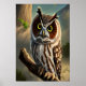 A Long-eared owl sitting outside with a tree and mountain in the background. This is a AI generated art.