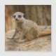 A cute baby meerkat sits on a tree stump, exuding innocence with a curious gaze. Soft fur and endearing features add to the charm of this delightful scene.