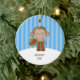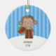There's an adorable monkey. It has holly on it's head. It has a red and green Christmas present in front of her.It has a light and dark blue background while the bottom is white. Personalise to make it special! Check out our many other designs! ©primsydodles