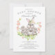 Cute baby shower design featuring mum and baby triplet bunnies with a delicate pink flower laurel. Flip our invite over to view a coordinating floral back for an extra special touch. Visit our shop to view this design for a boys, girls and twins baby shower.