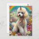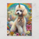 An adorable fluffy white poodle unicorn with a gold horn in an encaustic looking mixed media style