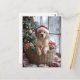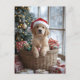 Celebrate the holiday season with this heartwarming image of a cute puppy wearing a Santa hat, peeking out from a basket filled with Christmas presents, with a beautifully decorated Christmas tree in the background.