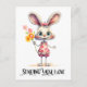An adorable cartoon rabbit dressed in pink floral outfit holds flowers and says sending you love