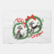 Adorable Retro Christmas Poodles Wreath Custom Kitchen Towel. Two adorable Grey/Black Poodles! Each Poodle is wearing a red collar with a bell on it, and is framed up with a pretty Holly Christmas Wreath and Merry Christmas text design. Add custom text on any white area if desired, using your choice of text(including type, size, colour, placement).  Fully customisable.