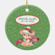 "My First Christmas" declares the banner beneath an adorable mouse image on this Holiday ornament. The mouse wears a red and white Santa hat and a red bow tie. Holly sprigs decorate the banner and the hat, and a red ribbon lies curled behind the image. Pale green snowflake confetti fills the background. The back of the ornament has a smaller version of the front image, with a banner holding two text fields for you to customise. A wonderful keepsake for Baby's First Christmas!
