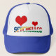 Adorable Seychelles Flag Hearts Patriotic Trucker Hat with the inscription "Seychelles" displayed on the front of the hat. Inscription is infused with the pattern and the colors from the Seychelles national flag. Two red hearts, one big and one small finish the design. Hearts are fully customizable or removable using "Customize it!" feature. Base hat color complements the design very well. This delightful hat is a lovely and unique gift. © CountriesOfTheWorld