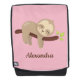 Having this cute sloth back pack will be sure to get a few smiles. With it's adorable little sloth hanging on a tree and customised with a name, on a pink background, it's sure to be a one of a kind bag on your back!