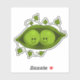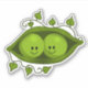 A cartoon illustration of two adorable little green peas cuddled up inside their green pod. Both look cosy and warm with smiles on their faces. Surrounding the pod are vines with little green leaves.