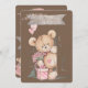 Adorable, little teddy bears are the centerpiece for this charming, baby shower invitation! A cute bear holding flowers and peeking out of a doorway with a border that says "Welcome Baby" adorns the front of the invitation. The back has the same cute bear with all of the customised shower details and beautiful watercolor touches. All done with a deep brown background and touches of lovely shades of pink. So sweet and cute!