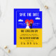 This fun, unique, and delightfully geeky save the date wedding announcement features 8-bit bride and groom characters gazing at each other in front of a red heart, with a bright blue sky with fluffy white 8-bit clouds, on a yellow ground.