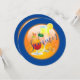 A fun and sunny illustration of a bright and colourful orange and yellow cocktail with orange slices on the rim and umbrella's surrounded by an orange circle on navy blue that has a navy and orange background on the back and templates for your custom wording.
