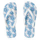 Adult flip flops perfect for all your summer fun, shown here in white with a colourful blue and purple flowers print with white wide straps and white foot bed.
