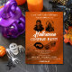 Funny Halloween costume party invitation for an adult Halloween party. Features a vampire themed design with a vampire, haunted castle, vampire fangs lips, and a coffin centred in the middle of the invitation, against a vintage-looking orange background. The phrase "Hungrily inBITE you" is a funny play on words that integrates the vampire theme, while at the bottom of the card the phrase "come thirsty" also alludes to the vampire theme but also to an adults only cocktail party.