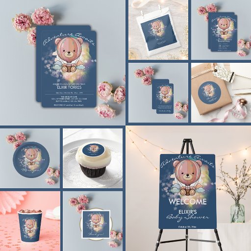 The "Adventure Awaits Bear Hot Air Balloon Baby Shower Collection" is filled with playful charm, featuring pastel-coloured hot air balloons floating among fluffy clouds and twinkling stars. Designed to evoke a sense of wonder and adventure, this collection is perfect for celebrating the little one's upcoming journey, with adorable baby-themed accents adding a sweet and whimsical touch. If you need any other matching product or customisation, kindly message via Zazzle.