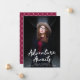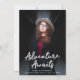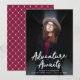 Trendy graduation announcements featuring the graduate's vertical photo with "Adventure Awaits" in white handwritten script lettering. Personalise the front of the Adventure Awaits graduation announcements by adding the graduate's name, school name, and graduation year. The announcement reverses to display an elegant burgundy and white trellis pattern.