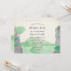 Adventure awaits as grey cliffs open up to a meadow and green mountains on this outdoor themed baby shower invitation.