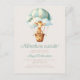 This cute baby shower invitation postcard features a sweet watercolor giraffe in a turquoise blue striped hot air balloon, above the words "Adventure awaits!" in turquoise script. Personalise the text with the name of the mum-to-be in script and the details in sans serif font on a beige background.