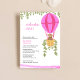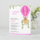 the design shows a cute baby shower invitation in pink and black typography and calligraphy at the left side and a hot air balloon with baby bear in it and lots of eucalyptus attached to it at the right side. the design is cute and beautiful and will be perfect for your baby shower.