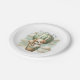 "Adventure Awaits" themed baby shower paper plates with an adorable white and tan puppy holding a teddy bear riding in a green hot air balloon. The watercolor green sky has white clouds with surrounding gold stars. Template included.