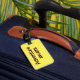 Yellow luggage tag with maroon words.